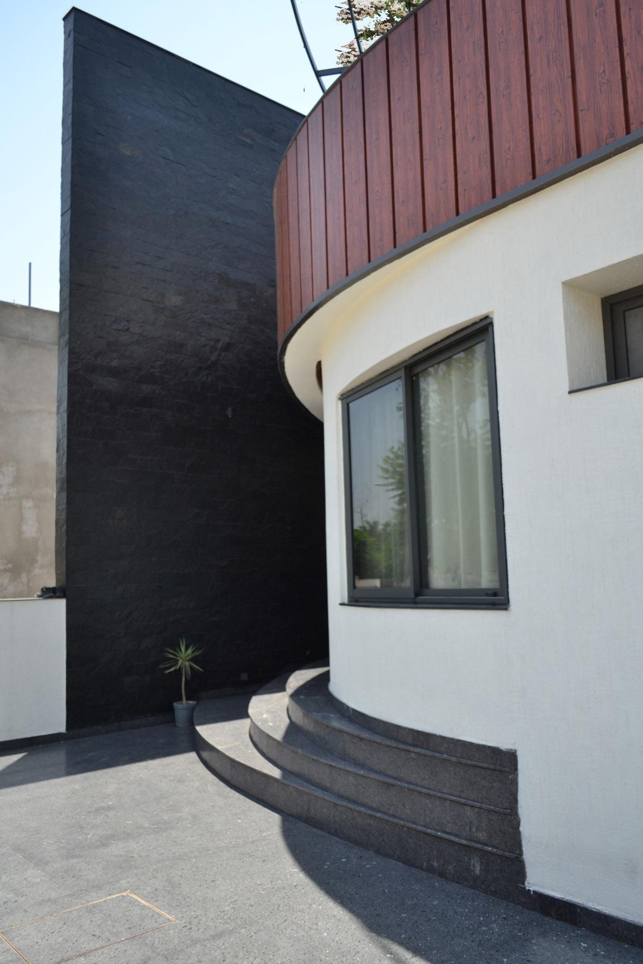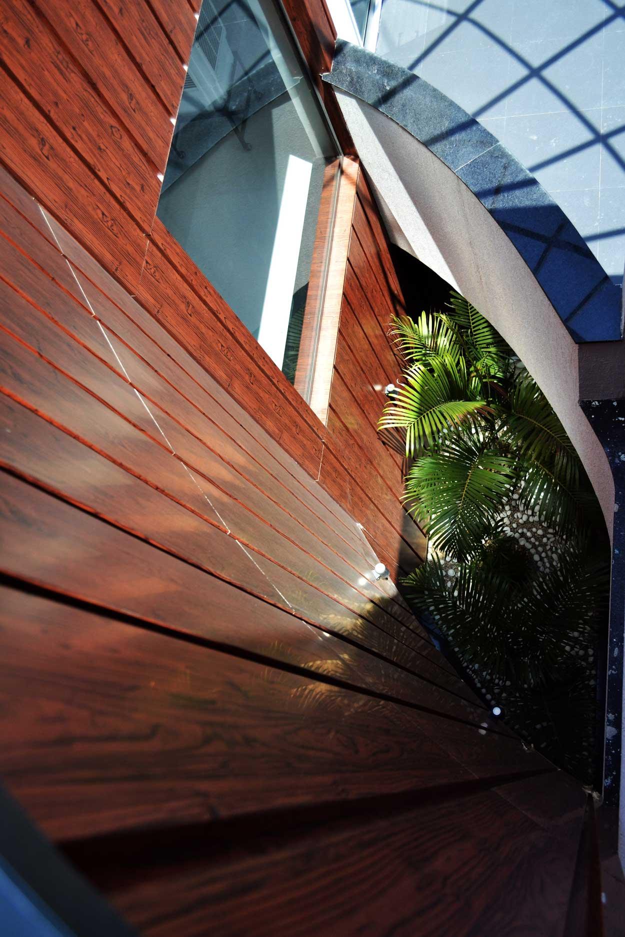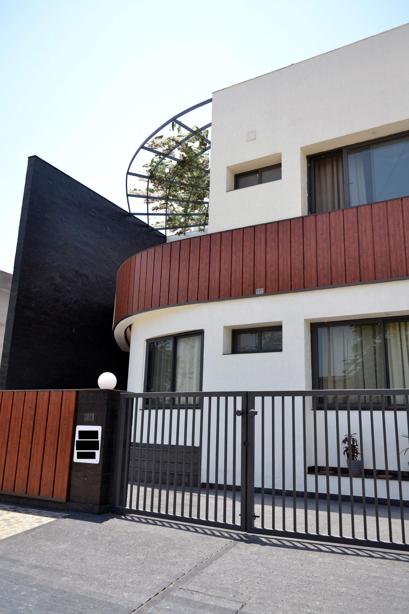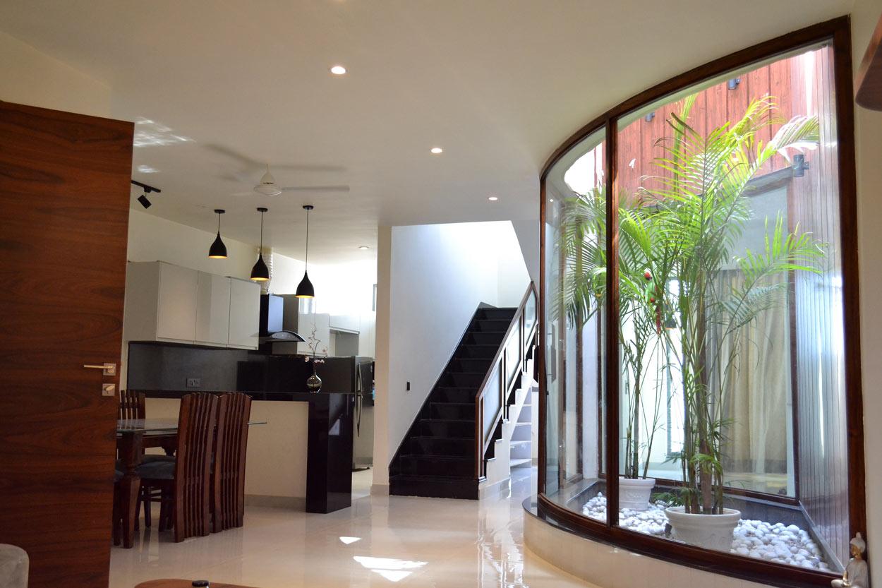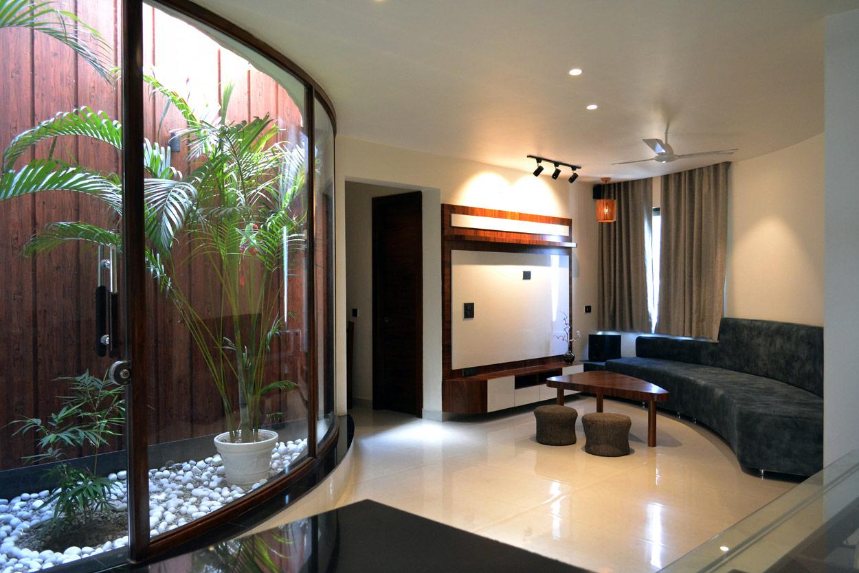 Gyre House came to TRBC in the form of a challenge to bend the perception of the kind of residence that can be achieved in a limited plot size. The challenges were multi-fold. The elevation was perceptually expanded by swooping in the corner (a visual trick), and the spaces inside respond to the resulting curve. In order to not compromise on the parking up front, an eye shaped void was scooped out of the built-mass vertically and a garden created in the belly of the house, creating the opportunity for each room to respond to the curvature thus generated, in their own way. A nouveau-dramatic palette was employed to play up the interiors, hemmed-in by cherry tones and simple black granite.